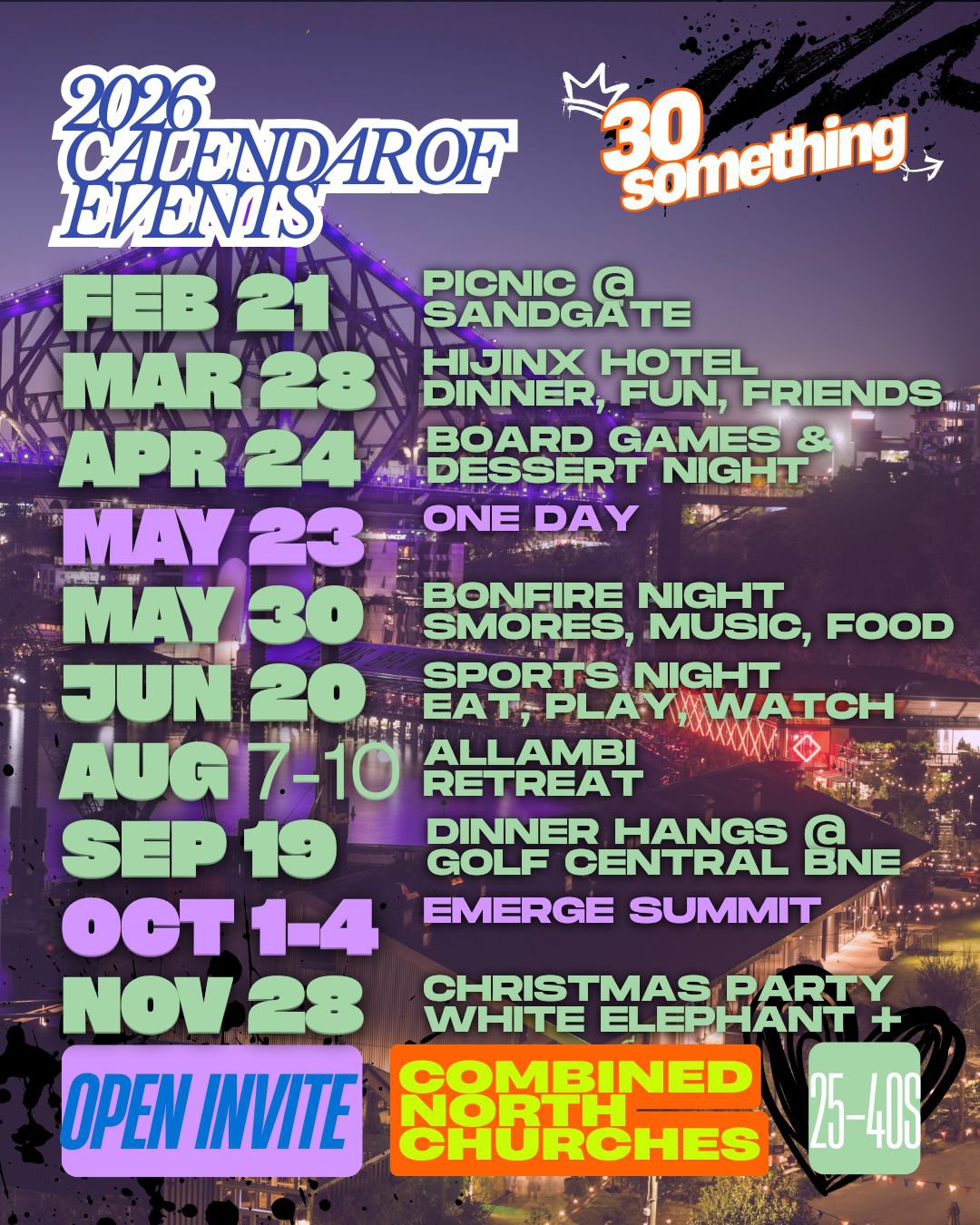 See the INSTAGRAM ACCOUNT for the latest event details: IG 30something_bne